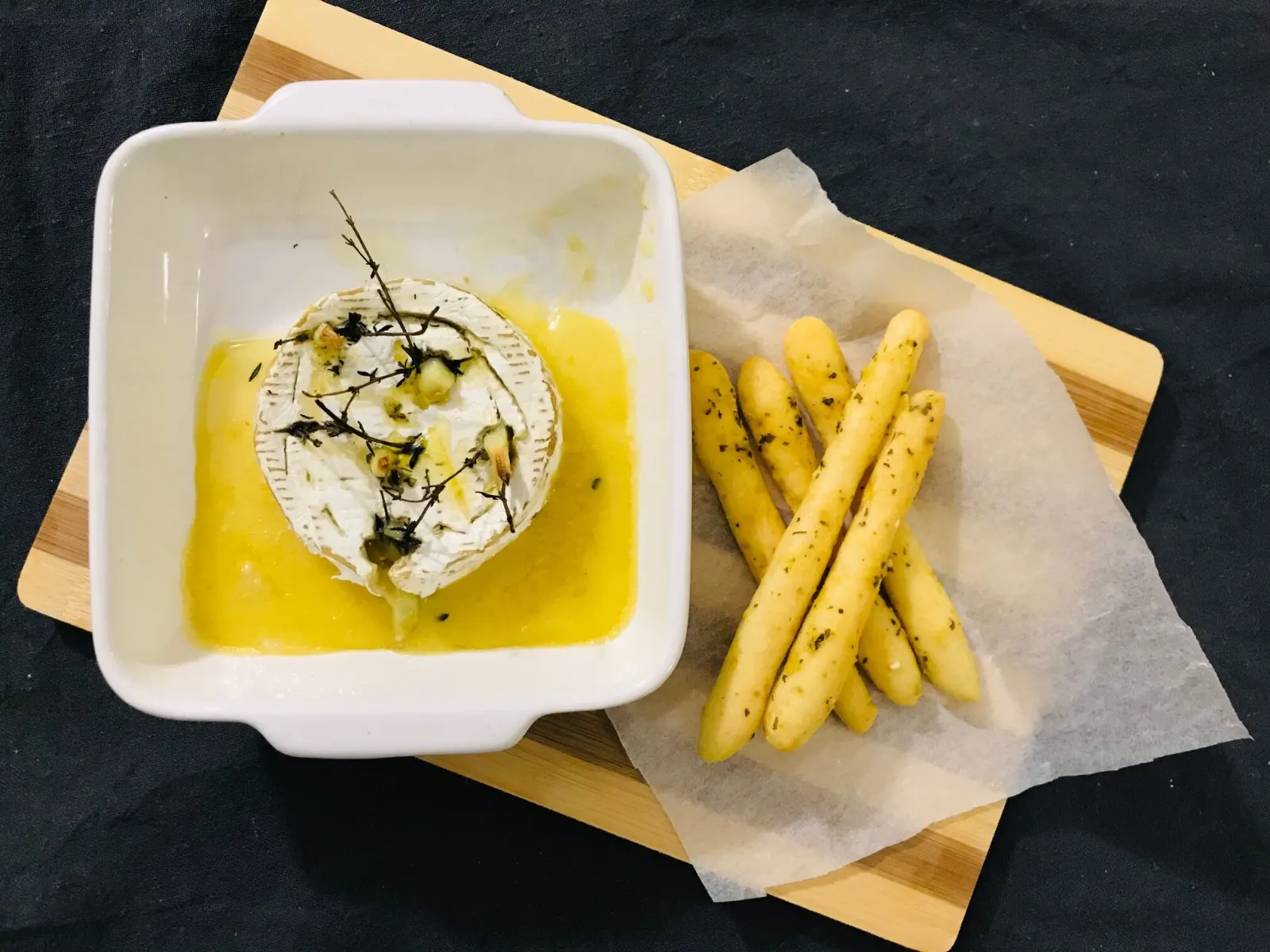 - Make a few holes in the top of the cheese and tuck in the thyme and garlic.