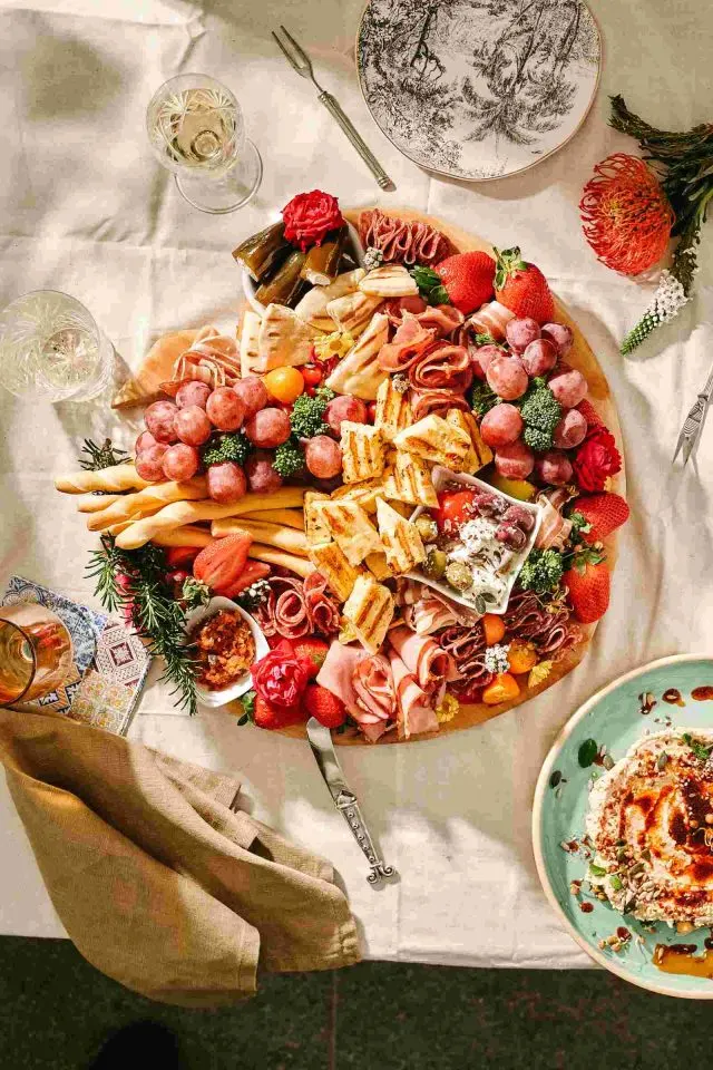 This generous platter was assembled using a selection of Dargle Valley Meats, Mezzo breadsticks (seeded or plain), Mediterranean Kitchen dips, a range of preserves, and cheeses. Grapes, broccoli sprouts, flowers, fragrant rosemary sprigs, and delectable strawberries were used for styling. All items are available in store.