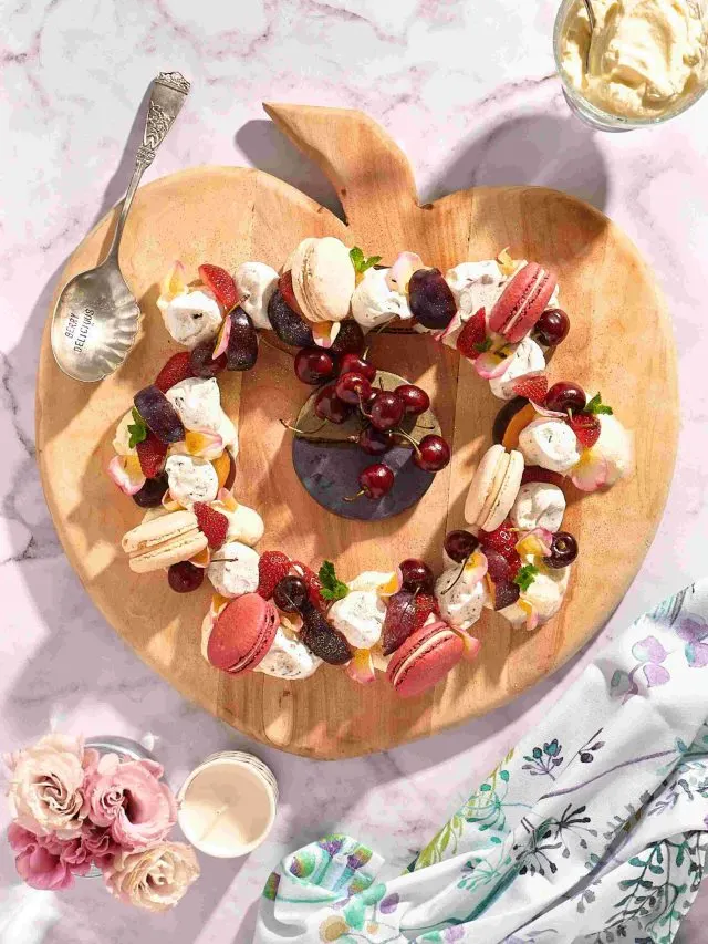 A playful take on a South African favourite. This dessert comes together in minutes by spooning thick whipped cream in a wreath shape, then decorating with macarons, meringues, fresh cherries, strawberries and plum slices. Garnish with sprigs of mint and edible flowers for a show-stopping (but super easy) dessert.