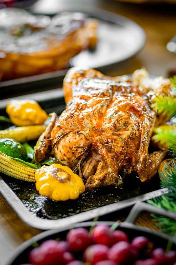 For extra flavour, brush your chicken with butter, garlic, and lemon after roasting. Then serve it with mashed potatoes, roasted carrots and pour on some gravy.