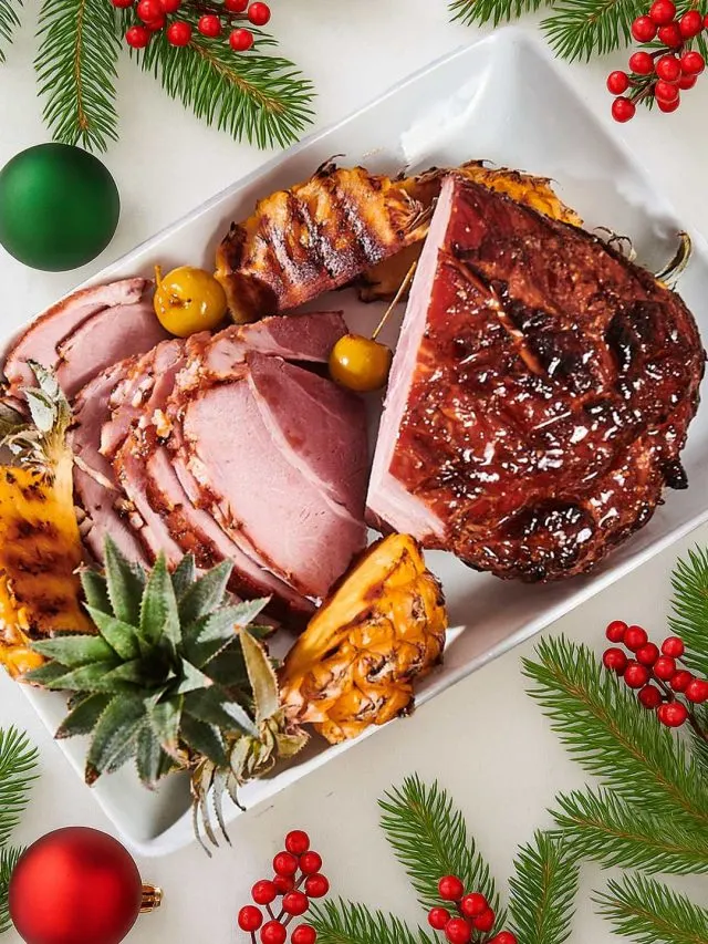 This bone-in gammon is the ultimate holiday roast. It is coated in a rich glaze of maple syrup, brown sugar, and Chinese five spices. The final touch is the pineapple rings and the bright red glace cherries, ensuring this main course is both a feast for the eyes and a perfect balance of salty, sweet, and spicy flavours.