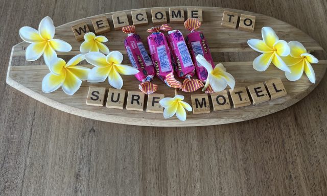 As you enter the penthouse, it is lit by natural light pouring through the windows. The placement of the windows allows for a sea view from one side of the chalet to the other, and the best view of the sea is from our very own private balcony! Surf Motel set up a lovely wooden welcome message on the table decorated with frangipani flowers and sweets, which added an extra personal touch to our stay. The chalet is airconditioned, perfect for the summer heat, and offers two bathrooms and bedrooms. Both with double beds, and the main room has an en-suite bathroom. The lovely open plan living makes the chalet look brighter, feel bigger and allows you to have a sea view even from the kitchen while making your morning cuppa. The chalets are fully self-catering and well-equipped with appliances, convenient utensils, and daily turndown service.